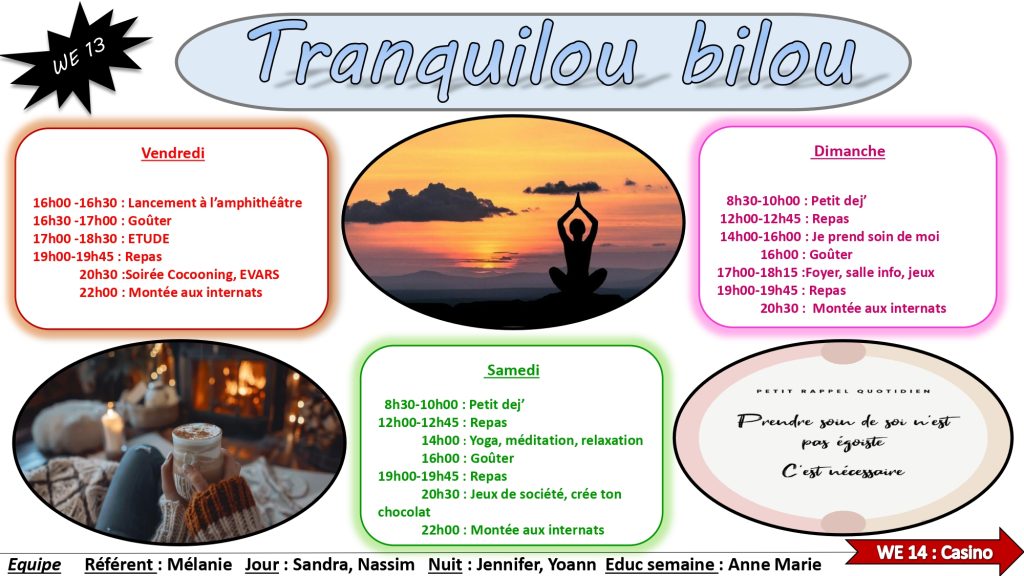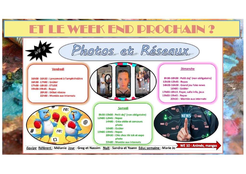 Les éducateurs et animateurs proposent aux élèves internet un programme alliant des temps de détente, de travail scolaire, de sorties et de jeux. Chaque semaine vous pouvez retrouver le programme et le bilan des week-ends et vacances au campus.