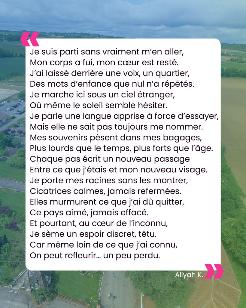 Dans le cadre d’une séquence en cours de français autour de la thématique de l’exil en poésie, une élève de 3ème a écrit un poème d’une grande sensibilité. À travers ses mots, elle donne voix à l’épreuve de l’exil, à la perte, à l’espoir et à la force intérieure que ce thème universel suscite. Ce texte témoigne de la richesse du travail mené en classe et de la capacité des élèves à s’approprier les sujets étudiés pour exprimer leur regard et leurs émotions.